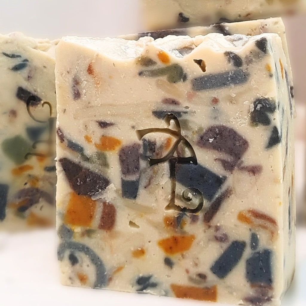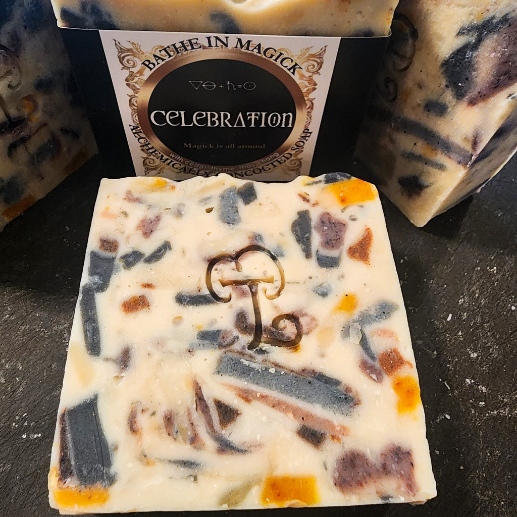 Ingredients - Moonlight (gold/silver/crystal) charged distilled water, organic coconut & virgin olive oil, sodium hydroxide, beeswax, charcoal/clay/plant colourants, non-synthetic pure essential oils of cedar, cypress, fir, thyme, peppermint, may chang & Love, Laughter and Magick